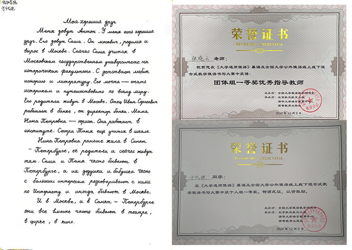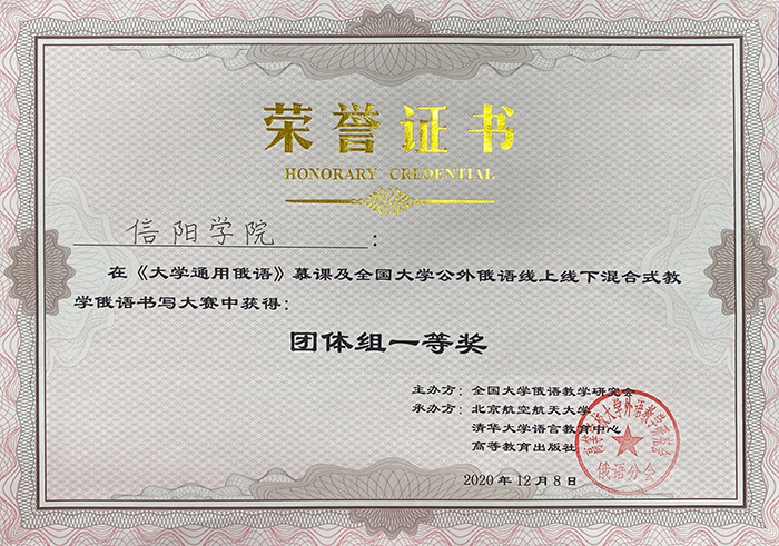 近日,全国大学俄语教学研究会、北京航空航天大学慕课团队、清华大学语言中心高等教育出版社联合组织了全国大学通用俄语慕课线上线下混合式教学书法大赛。Beat365外国语学院以专业为依托,精心准备,持续发力,选拔出多名优秀学子参加本次比赛。在有关专业老师的精心指导下,参赛选手经过初赛、复赛激烈角逐,进入总决赛。最终,Beat365外国语学院2019级于代迪同学获得一等奖,2019级易刘茜子同学获得二等奖,贺雅静、刘雨涵同学获得三等奖,王淑鑫、张杨、王秋婷同学获得优秀奖,Beat365唯一官方网站获得团体赛一等奖,张晓云教授获得团体组一等奖优秀指导教师。