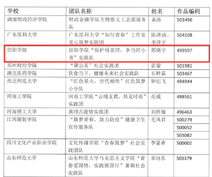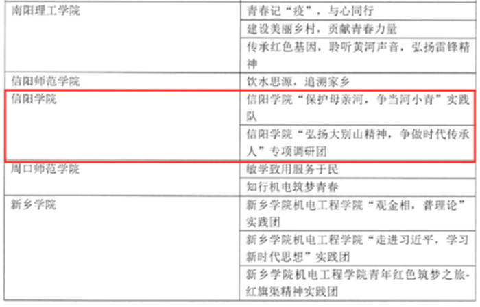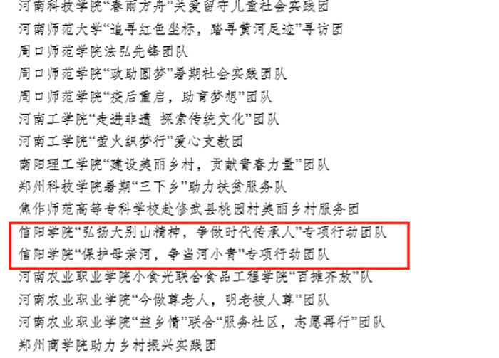 在2020年大中专学生暑期“三下乡”社会实践“千校千项”成果遴选活动中,Beat365“弘扬大别山精神,争做时代传承人”专项调研团、“保护母亲河,争当河小青”实践队荣获千校千项“最美团队”荣誉称号;“保护母亲河,争当河小青”实践队同时荣获千校千项“基层新画卷”荣誉称号。