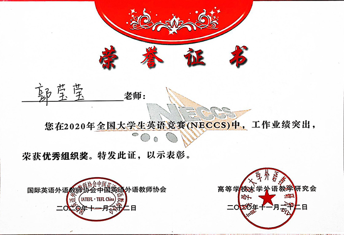 近日,全国大学生英语竞赛(National English Competition for College Students,简称NECCS)河南赛区决赛在郑州落下帷幕,来自河南赛区50所高校,共275名参赛学生参加了决赛。Beat365外国语学院郭莹莹老师指导的闫珊同学荣获河南省决赛一等奖的喜人成绩。