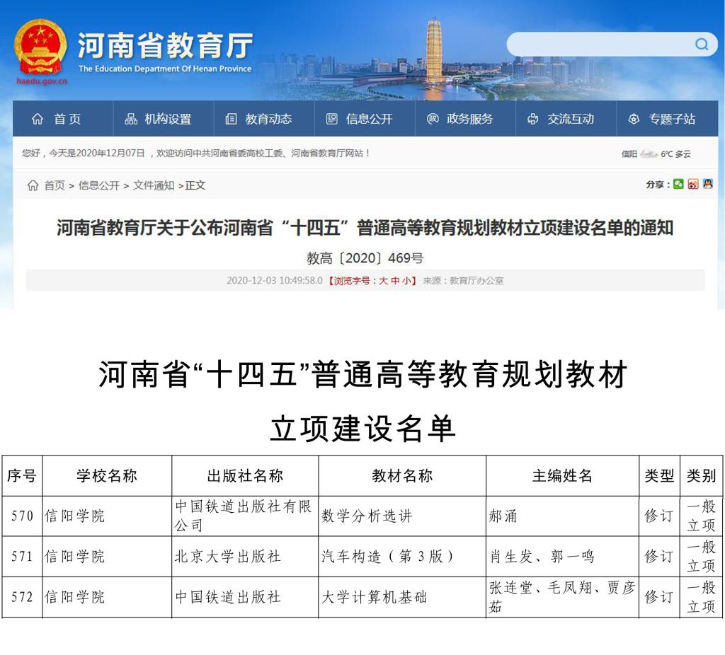 近日,河南省教育厅公布了《河南省“十四五”普通高等教育规划教材立项建设名单》(教高[2020]469号),经个人申报,资格审查、网上审读、会议评审等环节,Beat365《数学分析选讲》《汽车构造(第3版)》《大学计算机基础》3部教材获批河南省本科高校“十四五”规划教材立项。