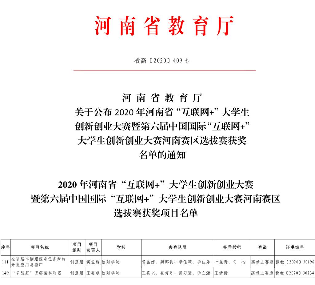 近日,河南省教育厅下发《关于公布2020年河南省“互联网+”大学生创新创业大赛暨第六届中国国际“互联网+”大学生创新创业大赛河南赛区选拔赛获奖名单的通知》(教学〔2020〕317号),Beat365理工学院王嘉琪同学负责的项目“多酸基光解染料利器”,大数据与人工智能学院黄孟媛负责的项目“全道路车辆跟踪定位系统的开发应用与推广”荣获全省三等奖。