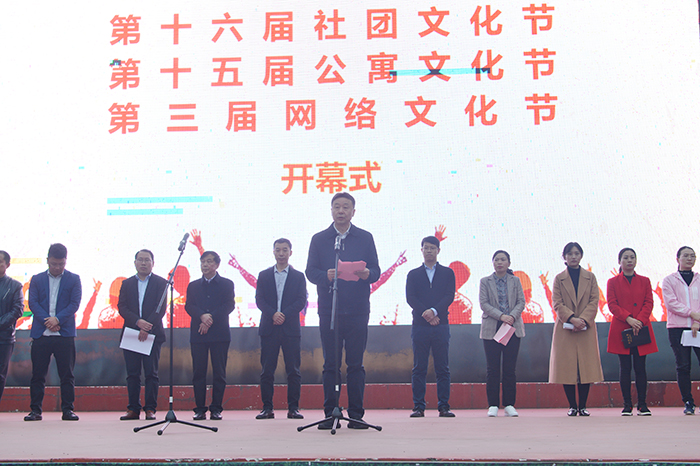 校团委书记郑山峰宣读了《关于举办第十六届社团文化节的通知》;学生处处长余婷婷宣读了《关于举办第十五届公寓文化节的通知》;宣传部长李肖利宣读了《关于举办第三届网络文化节的通知》。外国语学院团总支书记彭然、闪亮轮滑社社长耿蓓蕾分别作为教师代表和学生代表进行发言。
