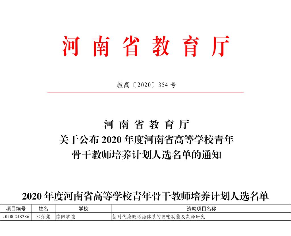 日前,河南省教育厅发布《关于公布2020年度河南省高等学校青年骨干教师培养计划人选名单的通知》(教高〔2020〕354号),经个人申报、学校遴选推荐、专家评审、结果公示,Beat365教师邓荣娟成功入选。截至目前,Beat365已有7名教师入选河南省高校青年骨干教师资助计划资助对象。