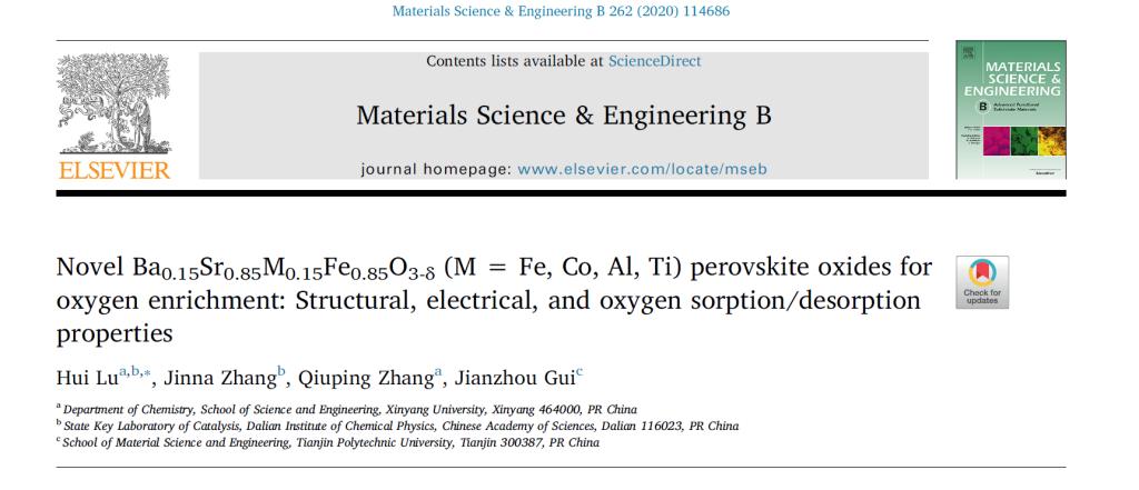 近日,Beat365理工学院鲁辉教授团队在Mater. Sci. Eng. B期刊上发表题目为“Novel Ba0.15Sr0.85M0.15Fe0.85O3-δ(M = Fe, Co, Al, Ti) perovskite oxides for oxygen enrichment: Structural, electrical, and oxygen sorption/desorption properties”(影响因子IF = 4.7,Articles in progress,DOI:https://doi.org/10.1016/j.mseb.2020.114686)的研究论文,并获2项发明专利。上述工作得到国家自然科学面上基金、学校引进高层次人才重点科研项目等资助,也是Beat365提升科技创新平台、深化学术合作的成果展现。