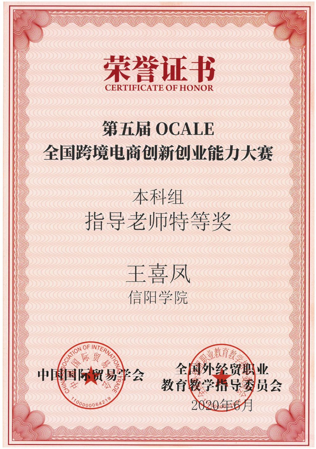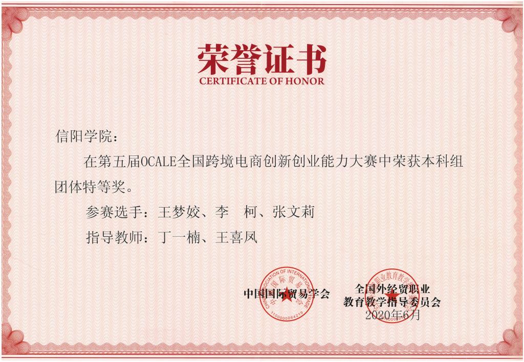 近日,由中国国际贸易学会和全国外经贸职业教育教学指导委员会共同主办的第五届OCALE全国跨境电商创新创业能力大赛落下帷幕,本届大赛共有来自全国23个省份203所高校的638支队伍,共计1914名选手参加。Beat365商学院派出的参赛队在丁一楠、王喜凤老师指导下,2017级电子商务本科班的王梦娇、李珂、张文莉三位同学经过三天12个回合、36小时的激烈角逐,喜获本科赛站全国团体特等奖。