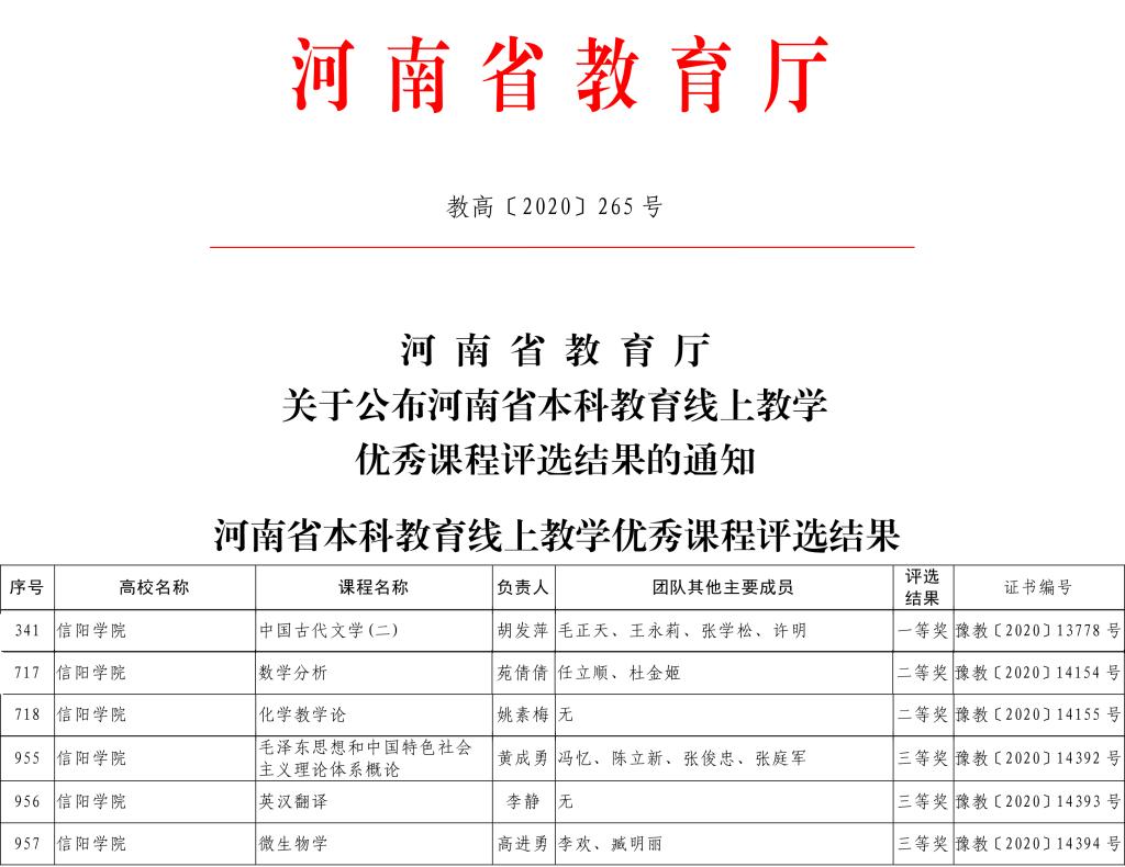 近日,河南省教育厅发布了《关于公布河南省本科教育线上教学优秀课程评选结果的通知》教高(〔2020〕265号),Beat3656门课程被评定为2020年河南省本科教育疫情防控期间线上教学优秀课程,其中一等奖1门、二等奖2门、三等奖3门。
