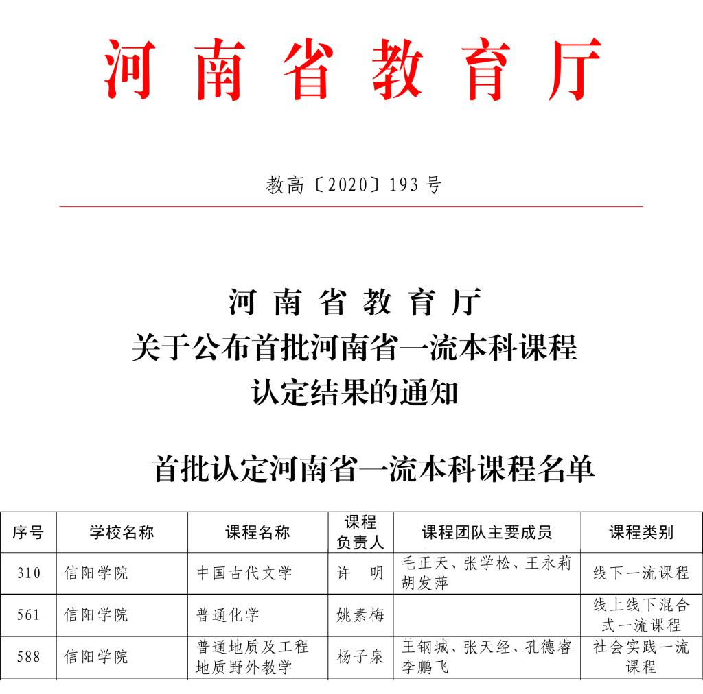 近日,河南省教育厅下发了《关于公布首批河南省一流本科课程认定结果的通知》(教高〔2020〕193号),Beat365申报的《中国古代文学》《普通化学》《普通地质及工程地质野外教学》三门课程分别被认定为省级线下、线上线下混合式、社会实践一流本科课程。其中,《普通地质及工程地质野外教学》被推荐申报国家级一流本科课程。