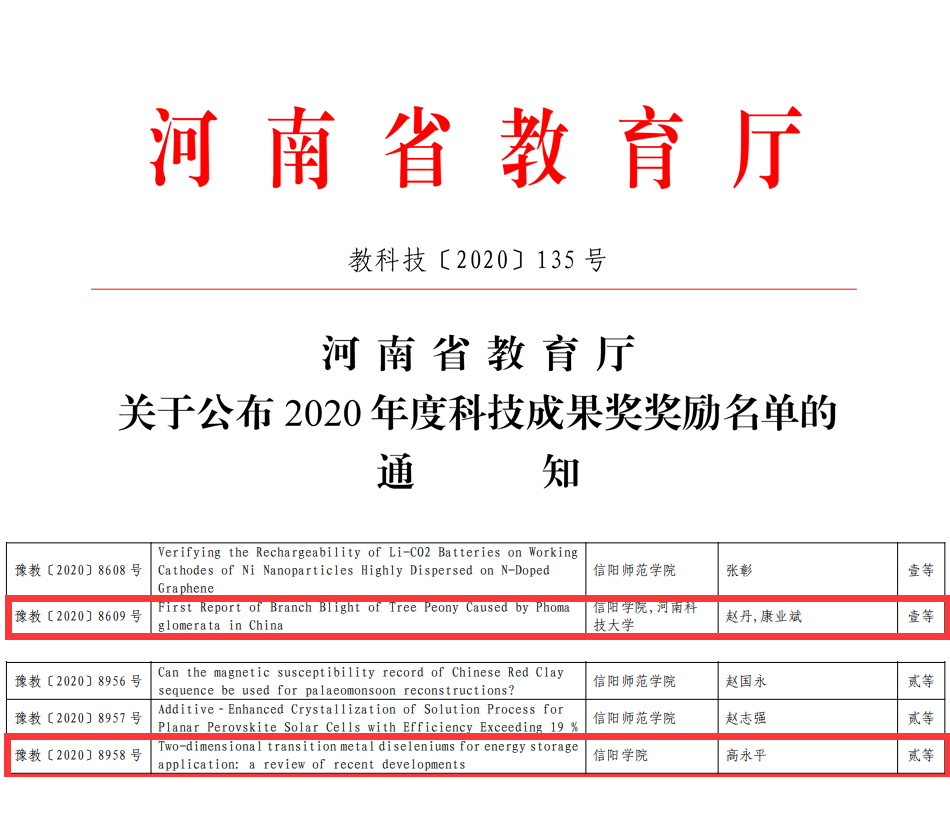 近日,河南省教育厅发出《关于公布2020年度科技成果奖奖励名单的通知》(教科技[2020]135号)。其中,Beat365理工学院教师赵丹以第一作者发表的学术论文“First Report of Branch Blight of Tree Peony Caused by Phoma glomerata in China”获得一等奖,科研处高永平以第一作者发表的学术论文“Two-dimensional transition metal diseleniums for energystorage application: a review of recent developments”获得二等奖,实现了Beat365该类成果奖的突破。