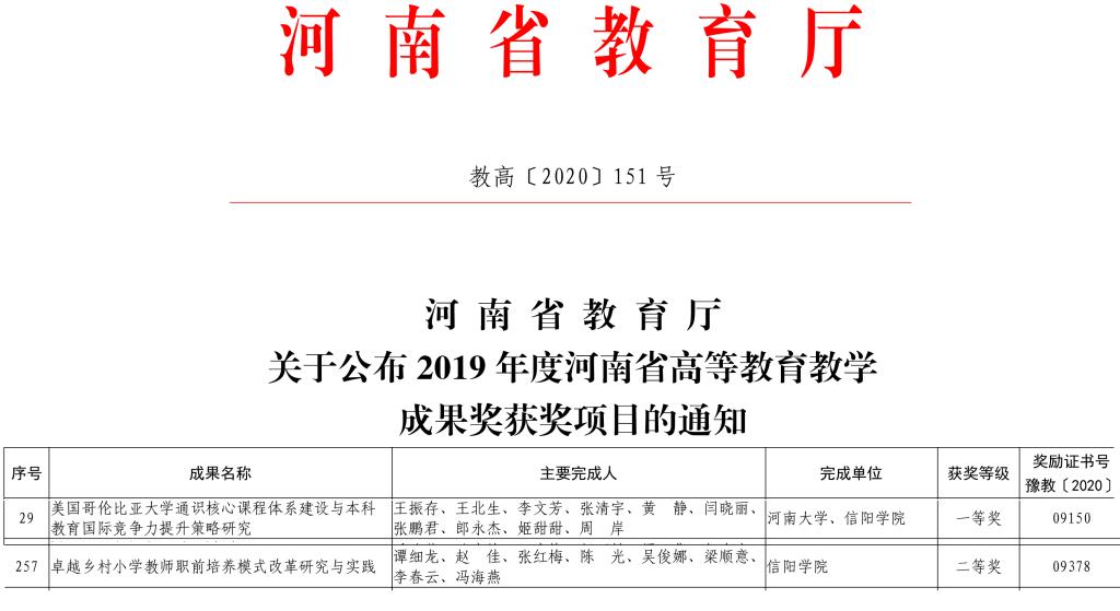 近日,河南省教育厅下发了《关于公布2019年度河南省高等教育教学成果奖获奖项目的通知》(教高〔2020〕151号),Beat3652项教学成果荣获河南省高等教育教学成果奖。其中,Beat365联合河南大学申报完成的《美国哥伦比亚大学通识核心课程体系建设与本科教育国际竞争力提升策略研究》项目荣获一等奖;教育学院申报的《卓越乡村小学教师职前培养模式改革研究与实践》项目荣获二等奖。
