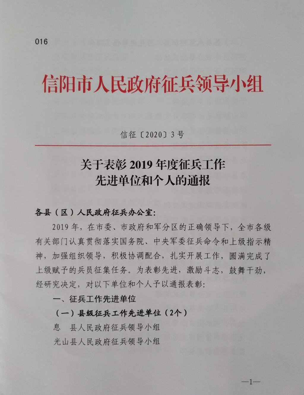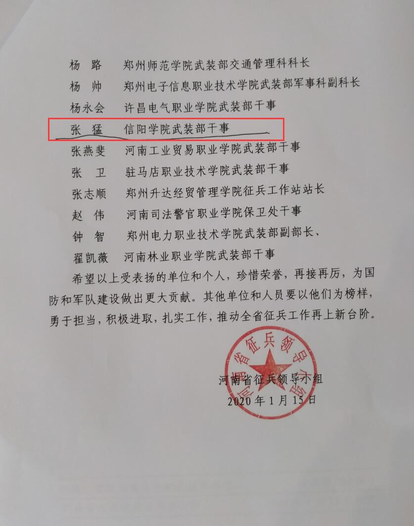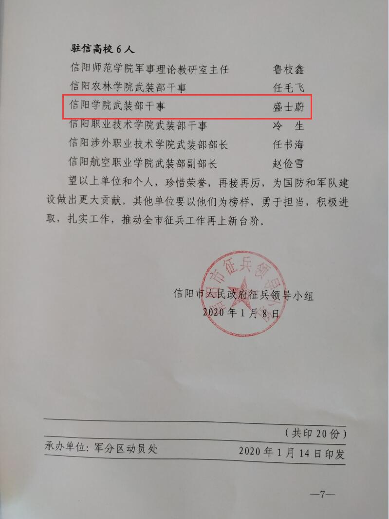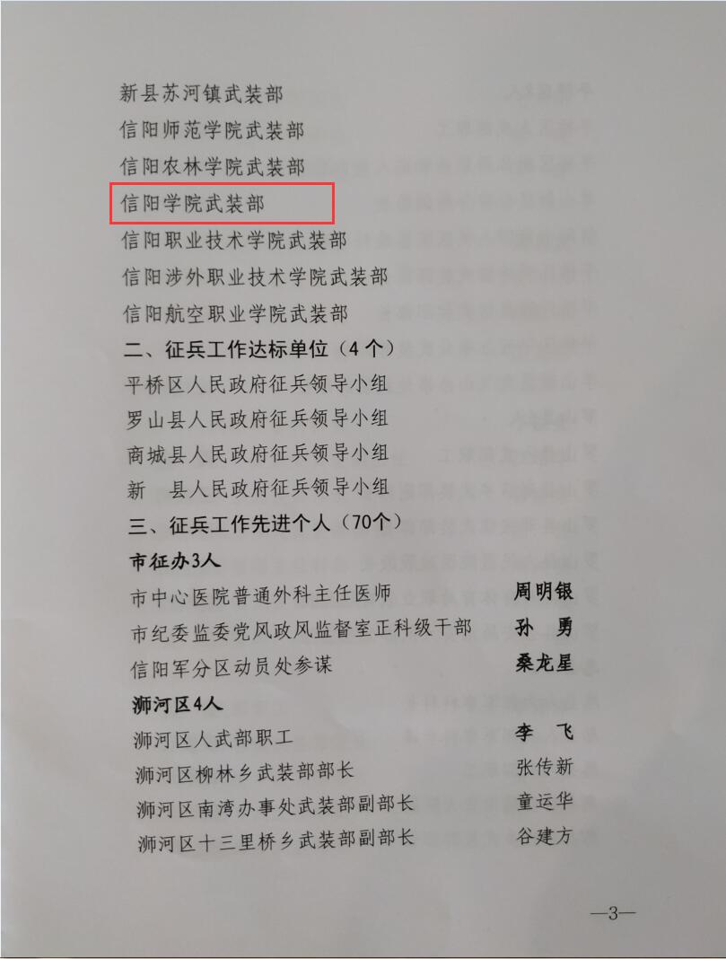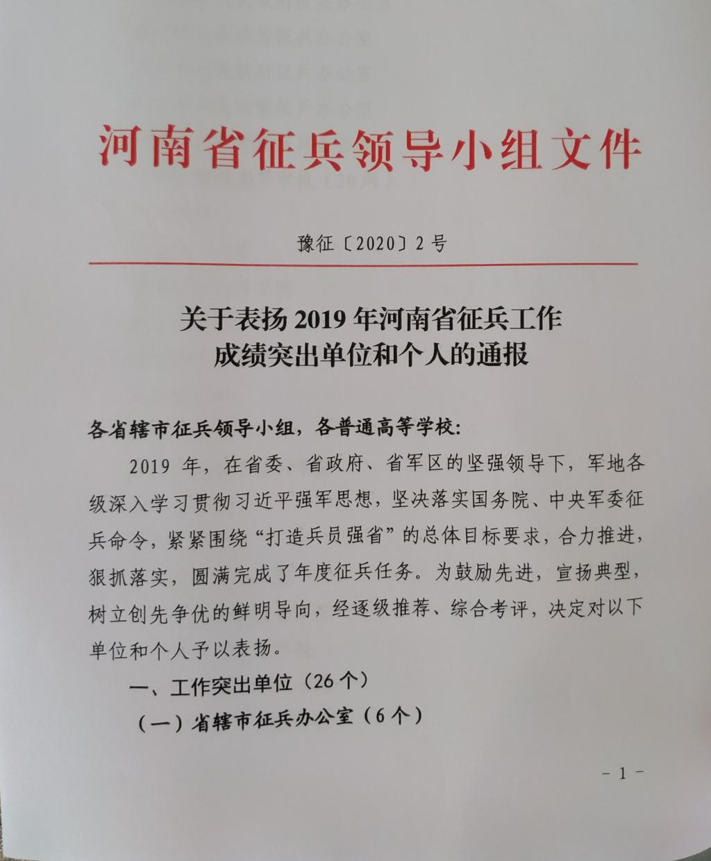 近期,河南省征兵领导小组下发了《关于表彰2019年河南省征兵工作成绩突出单位和个人的通报》(豫征〔2020〕2号),Beat365张猛同志荣获“征兵工作突出个人”荣誉称号;信阳市人民政府征兵领导小组发布了《关于表彰2019年度征兵工作先进单位和个人的通报》(信征〔2020〕3号),Beat365人民武装部荣获2019年度“征兵工作先进单位”荣誉称号,商学院盛士蔚同志荣获“征兵工作先进个人”荣誉称号。