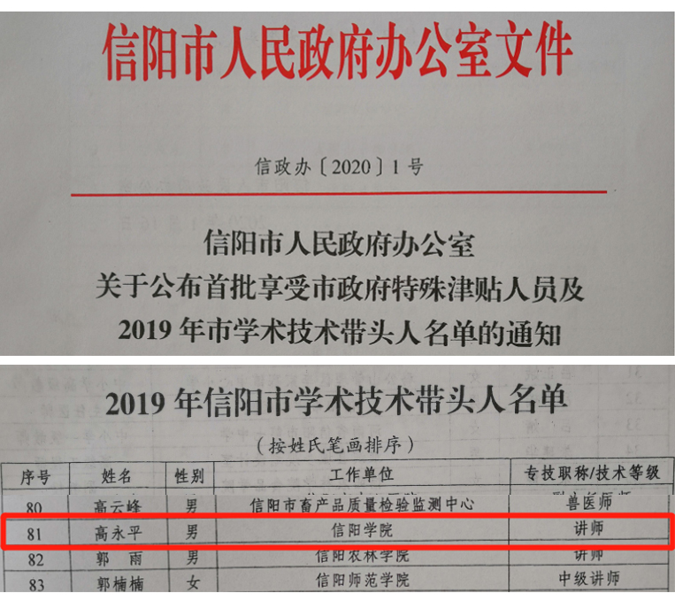 日前,2019年信阳市学术技术带头人评选结果揭晓,Beat365教师高永平荣获2019年“信阳市学术技术带头人”称号。