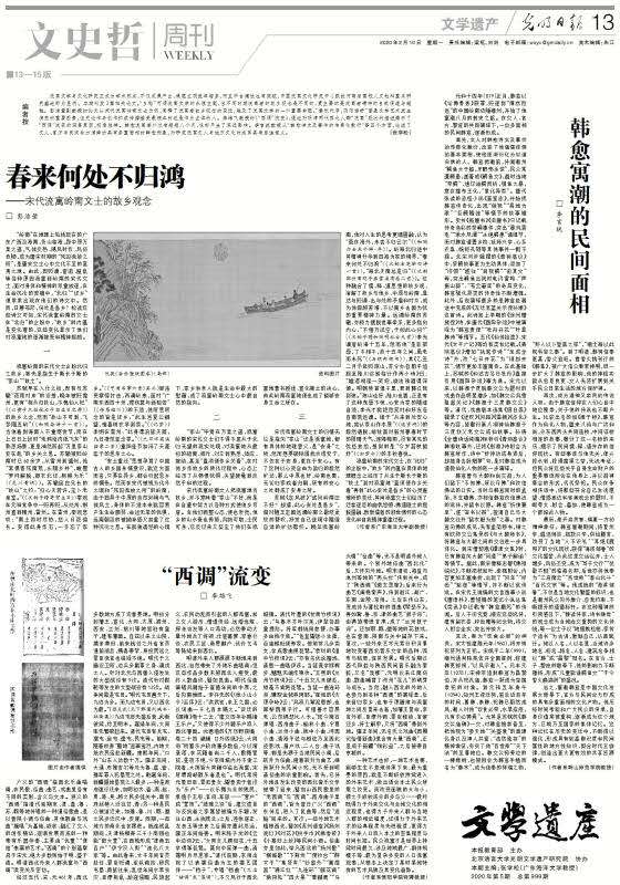 李雄飞的《“西调”流变》通过对明清两代西北人群“流寓”的描述,揭示了“西调”流变的深层原因。李言统的《韩愈寓潮的民间面相》从“韩愈诗文及事件的传奇化敷衍”等四个方面,论述了文人、官方与民间合力演绎的具有多重面相的韩愈形象。彭洁莹的《春来何处不归鸿——宋代流寓岭南文士的故乡观念》以宋代流寓岭南文士为例,阐释了流寓者故乡观念的变迁。