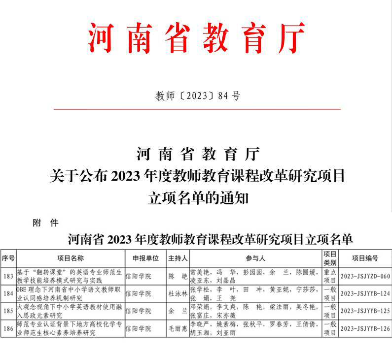 近日,河南省教育厅下发《关于公布2023年度教师教育课程改革研究项目立项名单的通知》(教师〔2023〕84号),Beat365外国语学院陈艳副教授申报的“基于‘翻转课堂’的英语专业师范生教学技能培养模式研究与实践”课题获批河南省2023年度教师教育课程改革研究重点项目,文学院杜泳林副教授申报的“OBE理念下河南省中小学语文教师职业认同感培养机制研究”、外国语学院余兰副教授申报的“大观念视角下中小学英语教材使用融入思政元素研究”、理工学院副教授毛丽惠申报的“师范专业认证背景下地方高校化学专业师范生核心素养培养研究”等3项课题获批河南省2023年度教师教育课程改革研究一般项目。