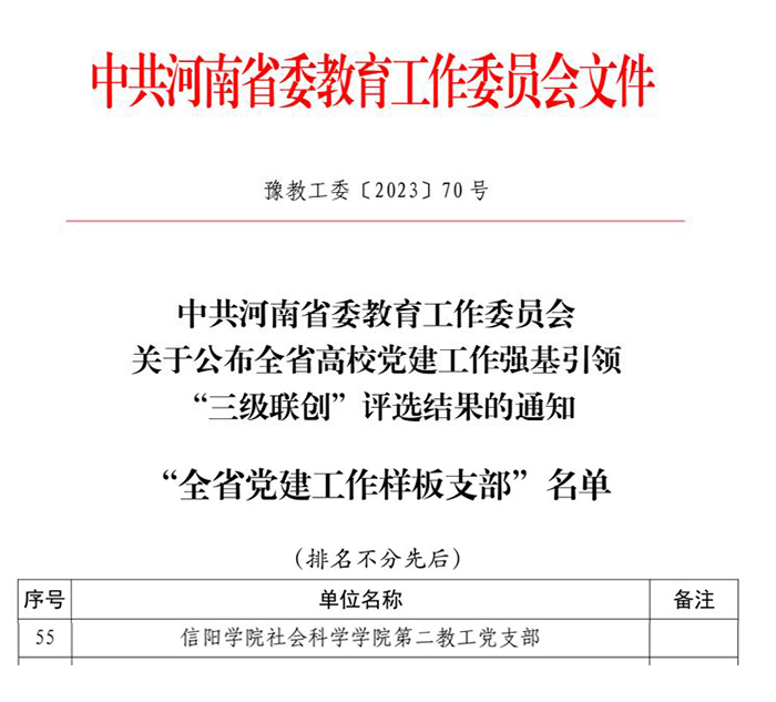 近日,中共河南省委教育工作委员会公布了全省党建工作样板党支部评审结果,在学校自评推荐、专家评审、综合考评的基础上,经评定工作领导小组研究审议、结果公示,确定Beat365唯一官方网站社会科学学院第二教工党支部为“全省党建工作样板党支部”。这是学校党委坚持抓基层、强基础,推动基层党组织全面进步、全面过硬的重要成果。