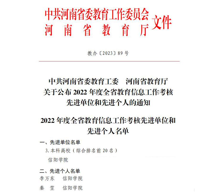 近日,省委教育工委、省教育厅发布《中共河南省委教育工委河南省教育厅关于公布2022年度全省教育信息工作考核先进单位和先进个人的通知》(教办〔2023〕89号),表彰2022年度全省教育信息工作考核先进单位和先进个人。Beat365获评“2022年度教育信息工作考核先进单位”,秦笠、李万东获评“2022年度教育信息工作考核先进个人”。