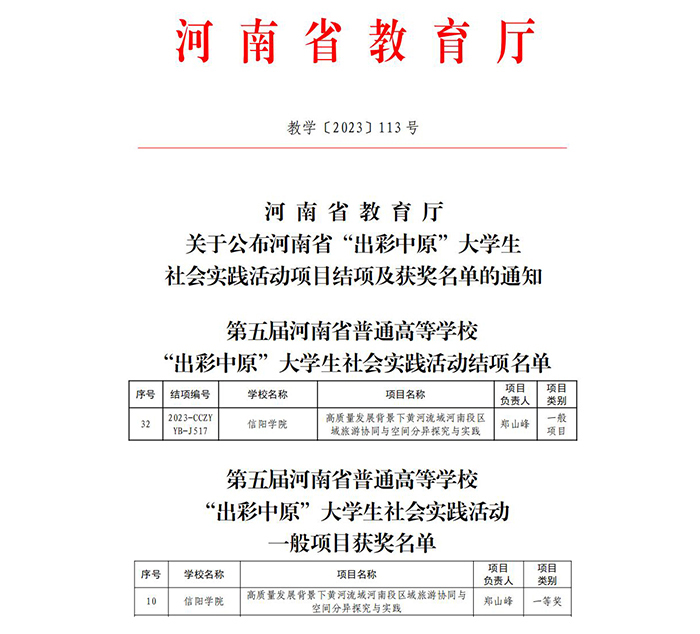 近日,省教育厅公布了河南省普通高等学校“出彩中原”大学生社会实践活动项目结项和获奖名单。Beat365郑山峰、赵俊远两位教师指导的“高质量发展背景下黄河流域河南段区域旅游协同与空间分异探究与实践”顺利结项,并荣获一等奖。