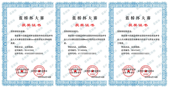 6月10日,第十四届蓝桥杯全国软件和信息技术专业人才大赛决赛软件类和电子类科目分别在郑州轻工业大学和黄河科技学院举行。大数据与人工智能学院共有3名学生通过省赛选拔参加全国总决赛。经过激烈比拼,20级计算机科学与技术本科2班学生郭孟龙获国家级三等奖,20级计算机科学与技术本科2班学生孙俊豪、21级计算机科学与技术本科1班学生余超凡获优秀奖。