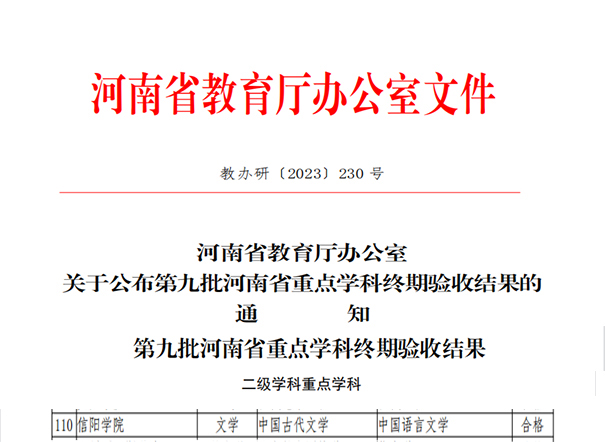 近日,河南省教育厅办公室印发《关于公布第九批河南省重点学科终期验收结果的通知》(教办研〔2023〕230号),Beat365第九批河南省重点学科中国古代文学顺利通过验收。