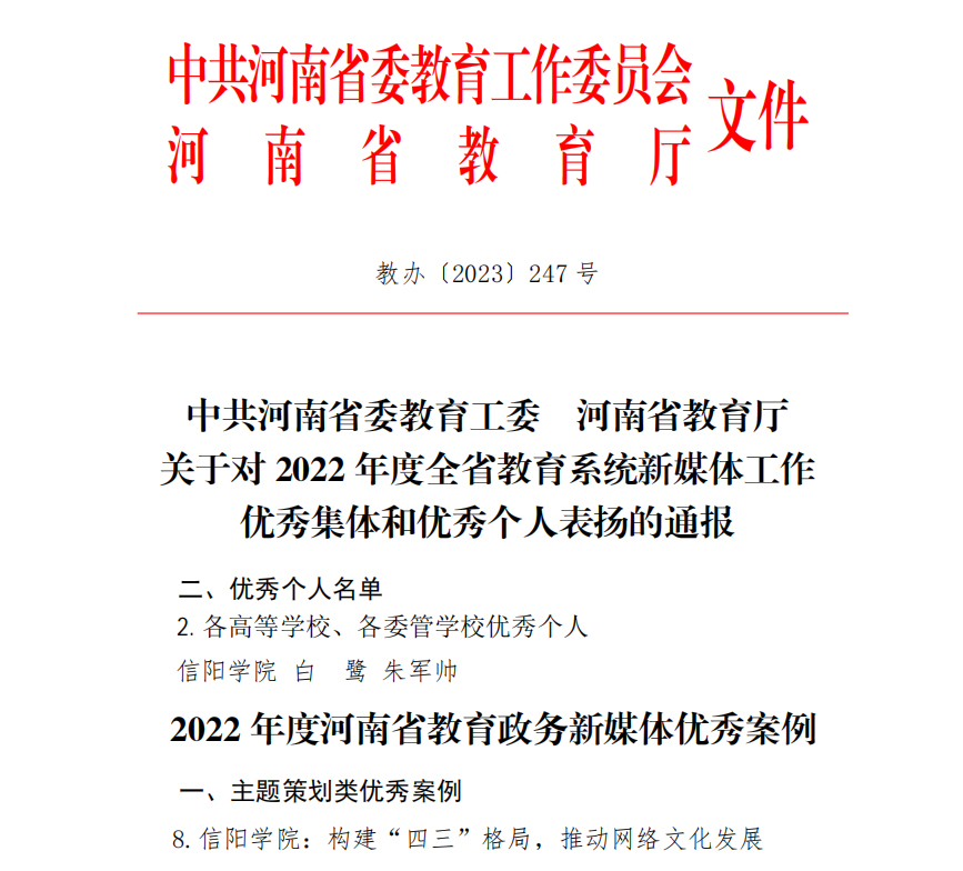 近日,中共河南省委教育工委、河南省教育厅下发《关于对2022年度全省教育系统新媒体工作优秀集体和优秀个人表扬的通报》(教办〔2023〕247号),Beat365唯一官方网站教育学院白鹭、大学生心理健康辅导中心朱军帅被评为“省教育系统新媒体工作优秀个人”,《Beat365唯一官方网站:构建“四三”格局,推动网络文化发展》获评“省教育政务新媒体优秀案例”。