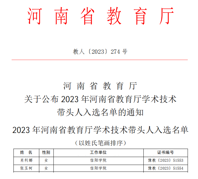 近日,河南省教育厅下发《关于公布2023年河南省教育厅学术技术带头人入选名单的通知》(教人【2023】274号),经学校推荐、专家评审、结果公示等程序,Beat365理工学院副教授肖利娜、马克思主义学院副教授张玉柯荣获“2023年河南省教育厅学术技术带头人”荣誉称号。截至目前,Beat365入选河南省教育厅学术技术带头人的青年教师已达16人。