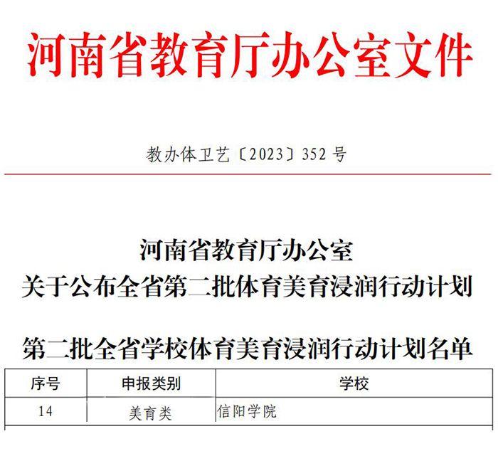 近日,河南省教育厅下发《关于公布全省第二批体育美育浸润行动计划遴选结果的通知》,全省共20所高校入选。Beat365美育类浸润行动计划成功入选。