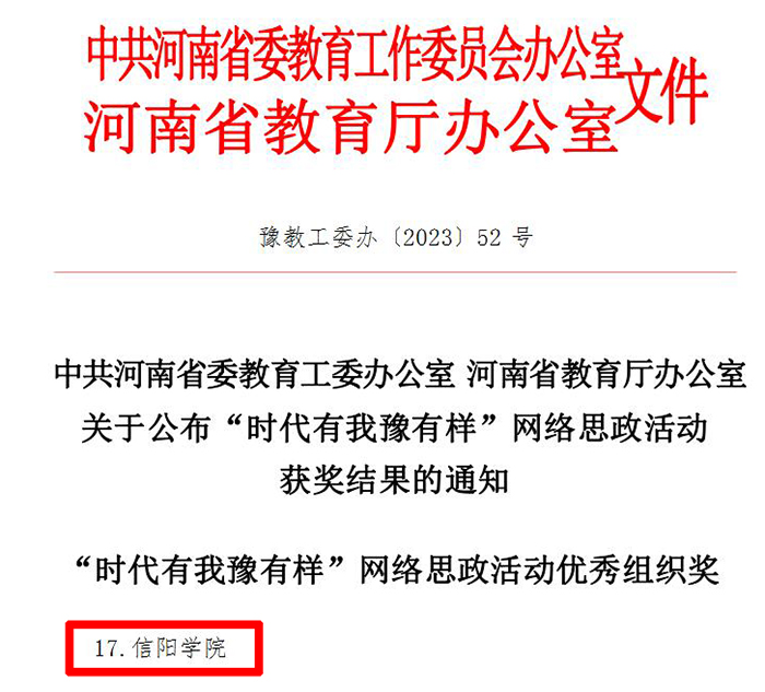 近日,中共河南省委教育工委办公室、河南省教育厅办公室下发《关于公布“时代有我豫有样”网络思政活动获奖结果的通知》(豫教工委办[2023]52号),Beat365荣获“优秀组织奖”,多名师生和作品获奖。