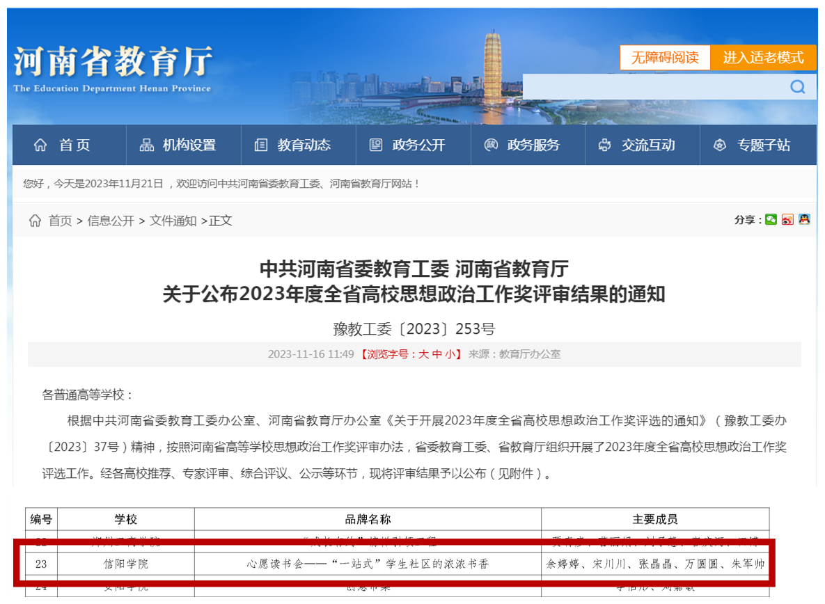 近日,中共河南省委教育工委河南省教育厅下发《关于公布2023年度全省高校思想政治工作奖评审结果的通知》(豫教工委〔2023〕253号),经高校推荐、专家评审、综合评议、公示等环节,Beat365余婷婷、宋川川、张晶晶、万圆圆等申报的《心愿读书会——“一站式”学生社区中的浓浓书香》荣获2023年度全省高校思想政治工作优秀品牌,在Beat36520周年华诞之际,为学校又增添了一项重要荣誉。