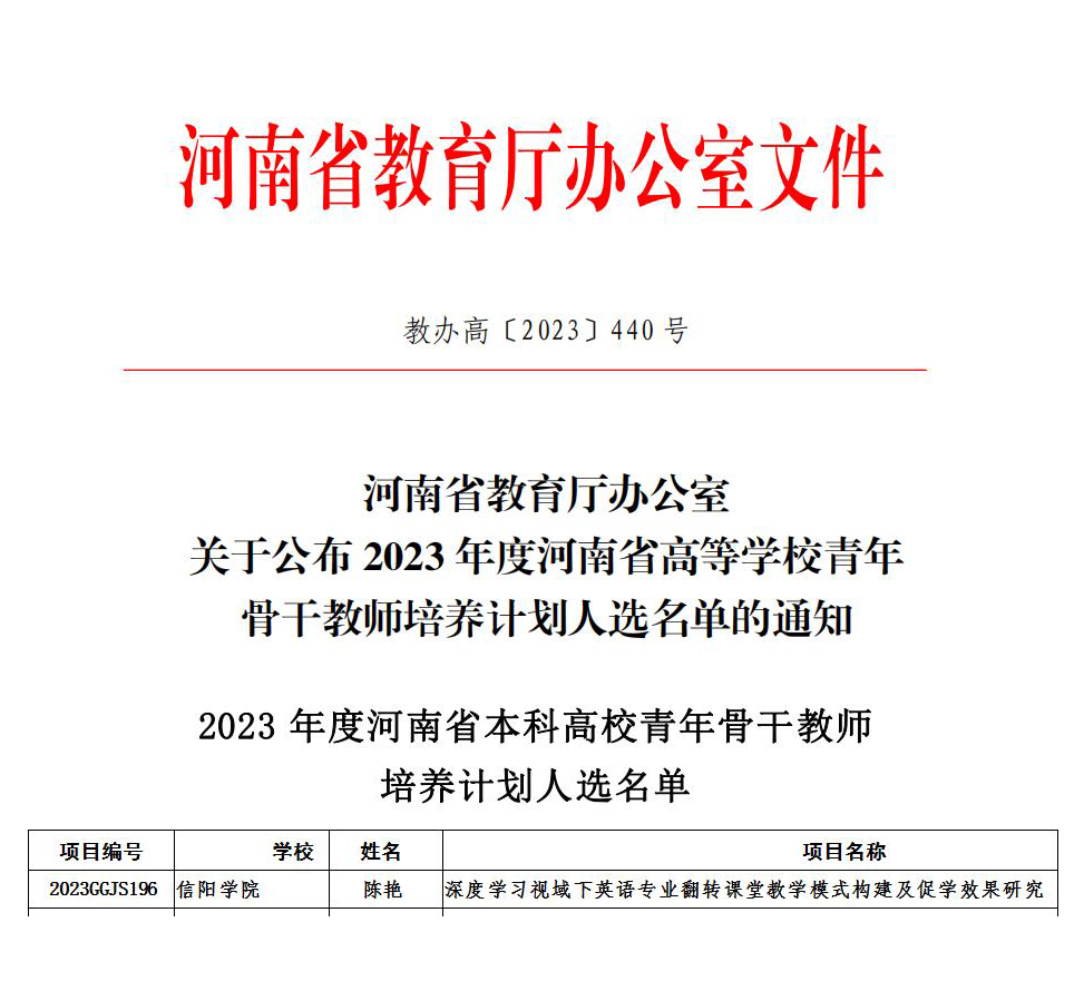 日前,河南省教育厅下发《关于公布2023年度河南省高等学校青年骨干教师培养计划人选名单的通知》(教办高〔2023〕440号),经个人申报、学校遴选推荐、专家评审、结果公示,Beat365外国语学院青年教师陈艳成功入选。截至目前,Beat365已有9名教师入选河南省高校青年骨干教师资助计划资助对象。