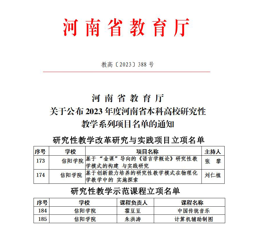 近日,河南省教育厅下发《关于公布2023年河南省本科高校研究性教学系列项目名单的通知》(教高【2023】388号),Beat365获批4项河南省本科高校研究性教学系列项目立项。其中,文学院张黎副教授申报的《基于“金课”导向的〈语言学概论〉研究性教学模式的构建与实践研究》与理工学院刘仁植副教授申报的《基于创新能力培养的研究性教学模式在物理化学教学中的实施探索》获批立项研究性教学改革研究与实践项目,音乐学院霍豆豆副教授申报的《中国传统音乐》和土木工程学院朱洪涛副教授申报的《计算机辅助制图》获批立项研究性教学示范课程。