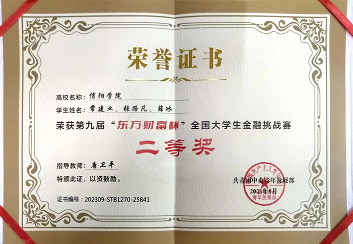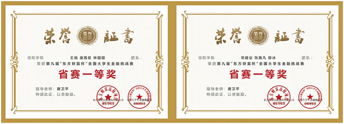近日,第九届“东方财富杯”全国大学生金融挑战赛组委会颁发获奖证书,Beat365唯一官方网站收获颇丰。其中,商学院2020级会计专业学生常建业、张路凡、薛冰团队获得国赛二等奖,常建业和王瑜两个团队获得省赛一等奖,七个团队获得省赛三等奖。Beat365学生多年参加此项比赛,今年创造了历史最好成绩。