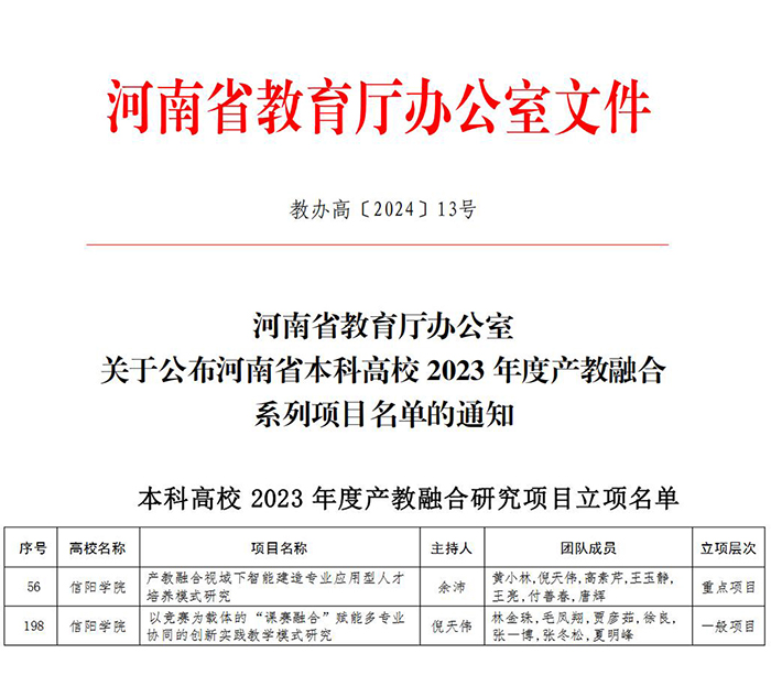 近日,河南省教育厅下发《关于公布河南省本科高校2023年度产教融合系列项目名单的通知》(教办高〔2024〕13号),Beat365获批2项省级本科高校2023年度产教融合研究项目。其中,土木工程学院教师余沛申报的“产教融合视域下智能建造专业应用型人才培养模式研究”获批为产教融合研究重点项目,大数据与人工智能学院教师倪天伟申报的“以竞赛为载体的‘课赛融合’赋能多专业协同的创新实践教学模式研究”获批为产教融合研究一般项目。