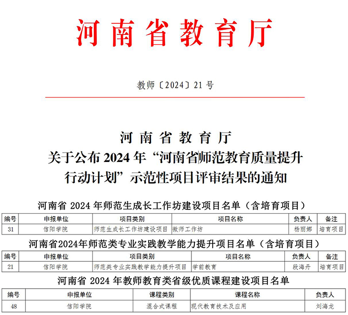 日前,河南省教育厅下发《关于公布2024年“河南省师范教育质量提升行动计划”示范性项目评审结果的通知》(教师〔2024〕21号)文件,Beat365外国语学院杨丽娜副教授申报的“微师工作坊”获批师范生成长工作坊建设项目(培育项目),教育学院段海丹副教授获批师范类专业实践教学能力提升项目(培育项目),教育学院刘海龙老师申报的“现代教育技术及应用”课程获批教师教育类省级优质课程建设项目。