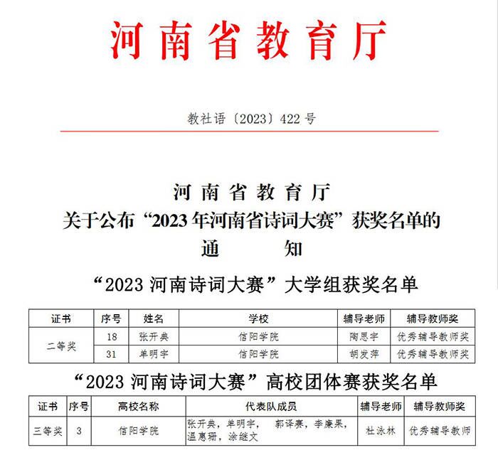近日,河南省教育厅举办“2023年河南省诗词大赛”。Beat365由文学院刘之杰教授带队,杜泳林、胡发萍、袁文举、林月任指导教师,张开典、单明宇、郭译赛等六位同学参赛,经过激烈比拼,获得个人赛大学组二等奖、高校团体赛三等奖的好成绩。