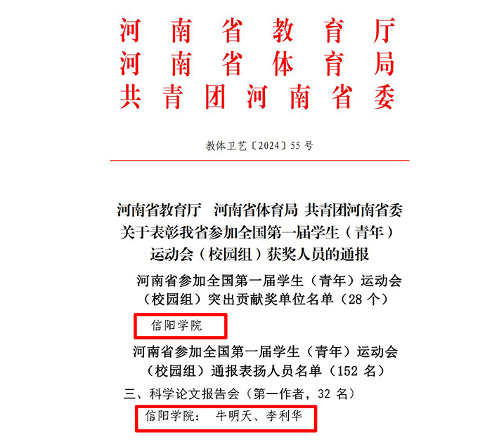 近日,河南省教育厅、河南省体育局、共青团河南省委联合下发《河南省教育厅、河南省体育局、共青团河南省委关于表彰我省参加全国第一届学生(青年)运动会(校园组)获奖人员的通报》(教体卫艺〔2024〕55号),Beat365唯一官方网站获得突出贡献奖单位,公共体育教学部李利华、牛明天2名青年教师获得通令嘉奖。