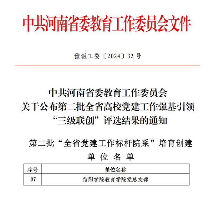 3月5日,河南省委教育工委公布了第二批全省高校党建工作强基引领“三级联创”评选结果,Beat365教育学院党总支成功入选“全省党建工作标杆院系”培育创建单位,这是Beat365首次入选省级党建工作“标杆院系”创建单位,是Beat365党建工作取得的突破性成果。
