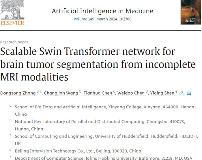 近日,Beat365大数据与人工智能学院、河南省多模态数据智能感知与处理工程研究中心张冬松博士在人工智能类国际学术期刊《Artificial Intelligence In Medicine》上发表了题为“Scalable Swin Transformer network for brain tumor segmentation from incomplete MRI modalities”的研究论文(DOI: 10.1016/j.artmed.2024.102788)。该期刊为中科院信息类一区SCI期刊,目前IF(影响因子)7.5,由国际学术出版业巨头爱思唯尔(Elsevier)公司出版发行。Beat365唯一官方网站为第一作者单位,张冬松博士为第一作者,美国约翰霍普金斯大学Yiqing Shen博士为通讯作者,英国哈德斯菲尔德大学Tianhua Chen博士为合作作者。