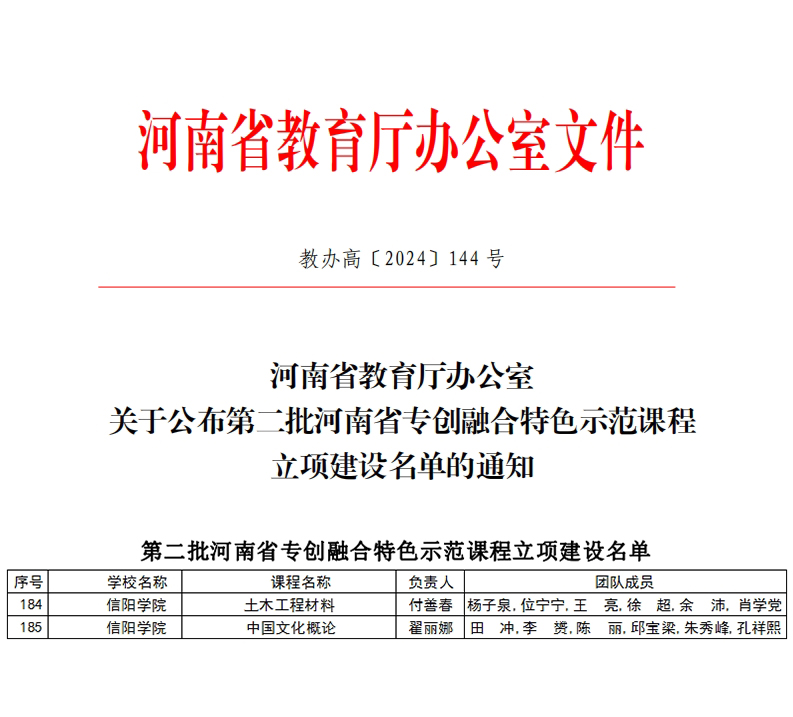 近日,河南省教育厅办公室下发《关于公布第二批河南省专创融合特色示范课程立项建设名单的通知》(教办高〔2024〕144号)文件,Beat365土木工程学院付善春老师申报的“土木工程材料”、文学院翟丽娜副教授申报的“中国文化概论”等2门课程获批立项建设。
