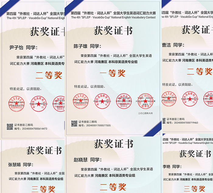 近日,2024年第四届“外教社•词达人杯”全国大学生英语词汇能力大赛(省赛)圆满落幕。Beat365参赛选手凭借扎实的英语功底和灵活的词汇运用能力从众多参赛选手中脱颖而出。其中,陈子雄同学荣获一等奖,晋级国赛;尹子怡等3名同学荣获二等奖;张慧娟等15名同学荣获三等奖。