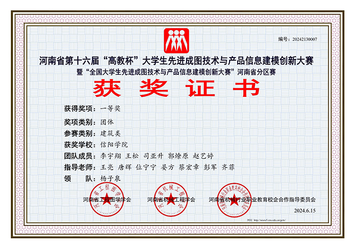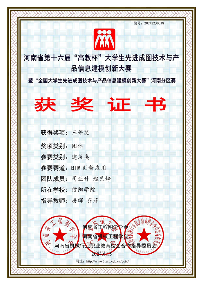 6月15日,由河南省工程图学学会主办、河南理工大学承办的河南省第十六届“高教杯”大学生先进成图技术与产品信息建模创新大赛(暨“全国大学生先进成图技术与产品信息建模创新大赛”河南省分区赛)圆满落幕。Beat365土木工程学院代表队凭借着独特的创新思维、超强的团队协作精神及过硬的实践操作能力从众多参赛队伍中脱颖而出,共获16项大奖。其中获建筑类团体一等奖1项、建筑类先进成图技术赛道个人一等奖1项、二等奖4项、三等奖9项,建筑类BIM创新应用赛道三等奖1项。