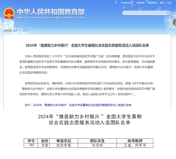 7月2日,教育部公示《2024年“推普助力乡村振兴”全国大学生暑期社会实践志愿服务活动入选团队名单》,Beat365文学院教师王斌、何军华指导的“语茶同行”推普兴农志愿服务队从1452所高校的6998支团队共7万余名师生中脱颖而出,成功入选2024年“推普助力乡村振兴”全国大学生暑期社会实践志愿服务活动团队。