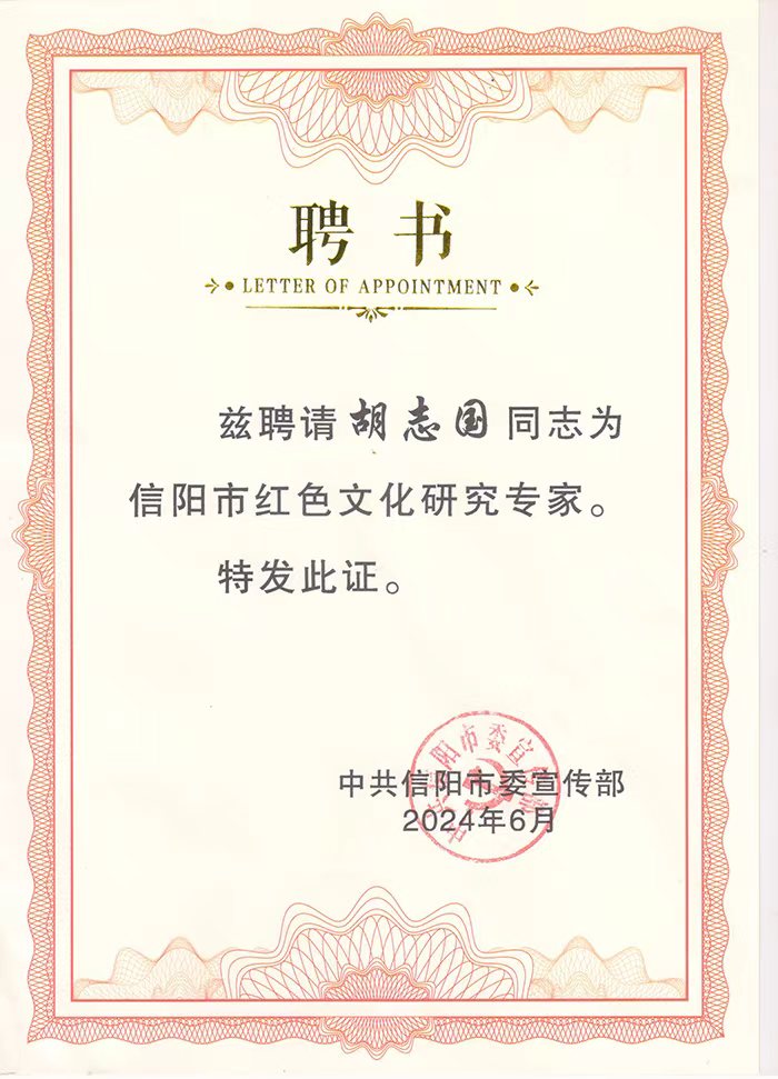 近日,中共信阳市委宣传部下发《关于印发信阳市红色文化研究人才入选名单的通知》(信宣文〔2024〕13号),Beat365社会科学学院党总支书记胡志国成功入选“信阳市红色文化研究专家”。