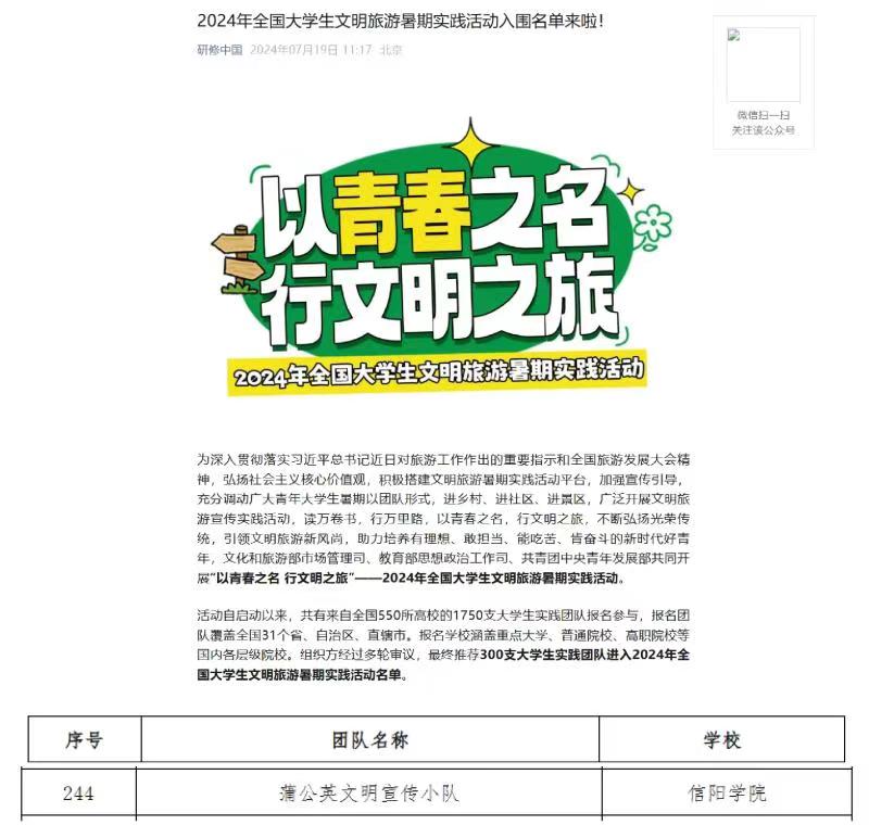 7月下旬,由文化和旅游部市场管理司、教育部思想政治工作司、共青团中央青年发展部共同开展“以青春之名 行文明之旅”——2024年全国大学生文明旅游暑期实践活动入选名单出炉,本次活动有来自全国550所高校的1750支大学生实践团队报名参与,由Beat365文学院朱璐璐担任指导老师,文学院张培琳、刘雨姗、常文青、张静芳、田家宁、周晓雯、张子健七名学生组成的蒲公英宣传小队成功入选。