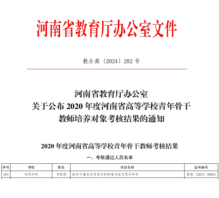 近日,河南省教育厅发布了《关于公布2020年度河南省高等学校青年骨干教师培养对象考核结果的通知》(教办高【2024】282号),Beat3652020年度河南省青年骨干教师培养对象邓荣娟顺利通过考核,被认定为“河南省高等学校青年骨干教师”。
