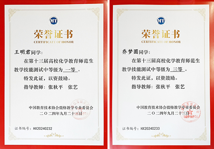 近日,第十三届全国高校化学师范生教学能力测试与交流展示活动圆满落幕。本次比赛吸引了来自全国65所本科高校、24所研究生院校的化学专业优秀师范生及指导教师共400余人参加。Beat365理工学院化学专业学生王明君和乔梦圆在此次大赛中表现卓越,分别斩获一等奖、三等奖。
