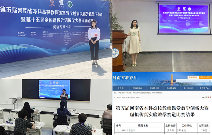近日,第五届河南省本科高校教师课堂教学创新大赛外语教学赛道和虚拟仿真实验教学赛道决赛圆满落幕。Beat365外国语学院教师陈宁荣获外语教学赛道大学英语综合小组决赛一等奖,张孟杰荣获外语教学赛道英语专业小组决赛一等奖,高蕊荣获外语教学赛道大学英语视听说小组决赛二等奖,商学院教师王亚丹荣获虚拟仿真实验教学赛道大赛决赛二等奖。