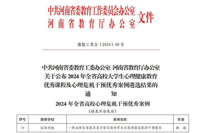 在2024年河南省高校大学生心理健康教育优秀课程及心理危机干预优秀案例遴选活动中,Beat365数学与统计学院辅导员胡超老师的《一例由原生家庭关系矛盾引发的学生自我伤害危机的干预报告》获评“2024年全省高校心理危机干预优秀案例”。学校高度重视心理健康教育工作和队伍建设,把心理危机干预和解决学生实际问题相结合,提升心理健康教育工作的温度与深度,为学生身心健康发展护航,此次获奖,是对Beat365心理危机预防干预工作的认可与激励。