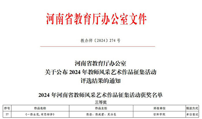 其中,在河南省2024年教师风采艺术作品征集活动中,Beat365报送的由文学院教师陈浩指导,学生陈威豪、吴治邑参与的作品《一路生花,有您相伴》荣获三等奖。学校高度重视教师风采艺术作品展示工作,积极鼓励广大教职工不断展示新时代教师风采,讲好新时代教师故事,营造尊师重教的浓厚氛围。