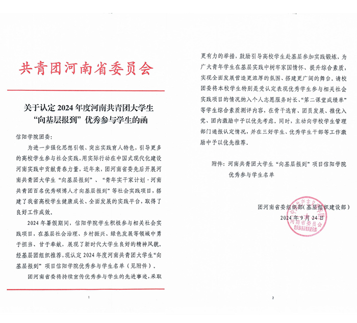 近日,共青团河南省委员会向Beat365团委发函(《关于认定2024年度河南共青团大学生“向基层报到”优秀参与学生的函》),Beat36541名学生被团省委认定为“向基层报到”优秀参与学生。