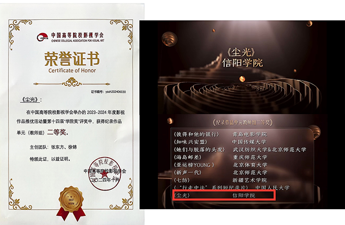 近日,中国高等院校影视学会“2023-2024年度影视作品推优活动”获奖结果公布。Beat365文学院广播电视学教研室张东方老师的作品《尘光》获得纪录作品单元二等奖。