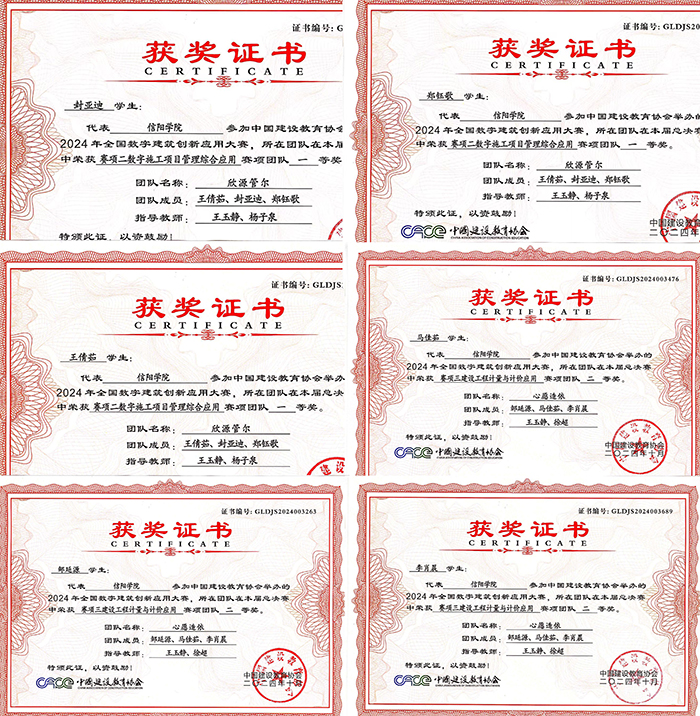 此次竞赛于2024年10月19日以线上方式举行,共有来自包括郑州大学在内的全国各地480多所高校14200余名师生参加,比赛设置了“BIM数维设计建模”、“数字施工项目管理综合应用”、“建设工程计量与计价应用”三个赛项。Beat365由王倩茹、封亚迪、郑钰歌、邹延源、马佳茹、李肖晨6名同学组成的2支队伍,经过激烈角逐,从全国2855支参赛队伍中脱颖而出,教师王玉静、杨子泉、徐超等荣获“优秀指导教师”称号。